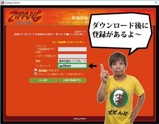 1. まずジパングカジノをダウンロード!! 2. 次に登録!! 当サイトからジパングカジノを初めて登録する方には、ボーナスチップとして入金不要30ドルをプレゼント!登録するとき、必ず以下のクーポンコード「zp30ent」を入力してください。